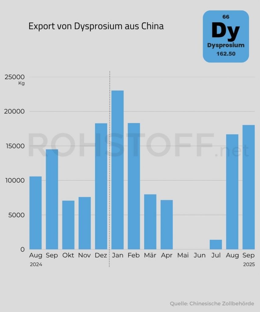 Insgesamt wurden im September 18.043 Kilogramm Dysprosium exportiert – das höchste Monatsvolumen seit Februar. Mehr als 17.000 Kilogramm davon gingen nach Südkorea. Kleinere Mengen wurden nach Estland, Portugal und Thailand geliefert.