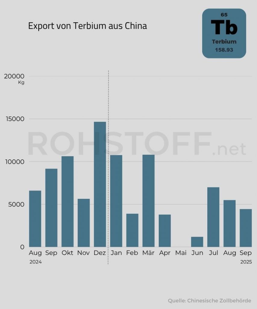 Die Terbium-Exporte sanken hingegen leicht auf 4.450 Kilogramm, von 5.500 Kilogramm im August. Fast das gesamte Material – 4.000 Kilogramm – wurde nach Japan geliefert, geringe Mengen gingen nach Südkorea und Estland.