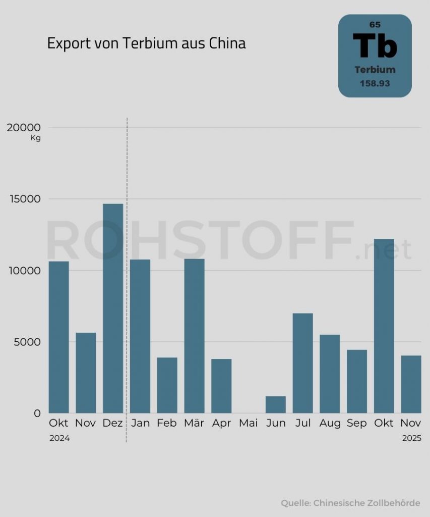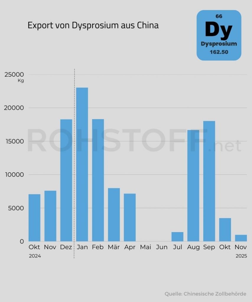 Wie neue Daten der chinesischen Behörden zeigen, ist im November der Export der für Magnettechnologien relevanten Seltenen Erden Dysprosium und Terbium aus China deutlich zurückgegangen. Für beide gelten seit April Ausfuhrauflagen, die sich auf die Verfügbarkeit im Markt auswirken. Bei Dysprosium ist im Vergleich zum Vormonat Oktober die Ausfuhrmenge um knapp 72 Prozent auf 995 Kilogramm gesunken. Wichtigstes Empfängerland war mit Abstand Vietnam, gefolgt von Malaysia, Korea und Russland. Bei Terbium gingen die Exporte um knapp 67 Prozent auf 4.045 Kilogramm zurück. China lieferte in diesem Monat fast ausschließlich nach Japan, kleinere Mengen gingen an Russland und Südkorea.
