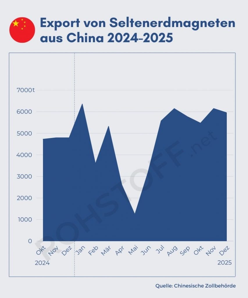 Der Anstieg der Ausfuhren zum Jahresende konnte zwischenzeitliche Versorgungsunterbrechungen ausgleichen, die durch Pekings im April eingeführte Exportkontrollen ausgelöst worden waren. Die Engpässe betrafen insbesondere Produkte mit den Seltenerdelementen Dysprosium und Terbium. Marktteilnehmern zufolge verbesserten sich die administrativen Abläufe im Laufe des Jahres, sodass Exporteure Rückstände abbauen und den Auftragsstau abarbeiten konnten.