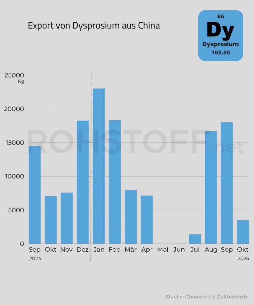 Seit Jahresbeginn liegen die Dysprosiumexporte rund 27 Prozent unter dem Niveau des Vorjahreszeitraums. Das verdeutlicht, wie stark sich die seit April bestehenden Exportauflagen für dieses wichtige Seltenerdmetall nach wie vor auf die weltweite Versorgung auswirken.