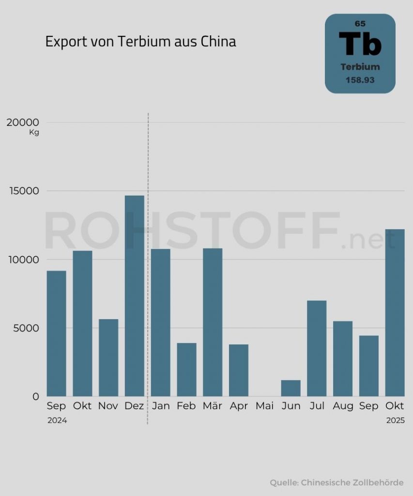 Im Gegensatz dazu erholten sich die Terbiumexporte: Im Oktober wurden 12.200 Kilogramm ausgeführt, nach nur 4.450 Kilogramm im September. Die Exportmenge von Oktober markiert das höchste monatliche Volumen in diesem Jahr. Davon gingen 6.000 Kilogramm in die USA, 5.200 nach Japan und 1.000 nach Estland.